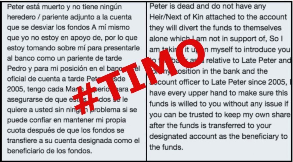 Se recibe vía email/correo electrónico. Se trata de una misiva en la cual te hacen creer que eres heredero de una gran cantidad de dinero o que vas a recibir una donación. Únicamente para hacer efectivo el pago de la supuesta cantidad de dinero prometida, previamente es necesario que realices una transferencia a la persona que contactó contigo con la excusa de que es necesario realizar un pago de tasas o desbloqueo del dinero, el cual será devuelto en el momento en que se realice la donación.