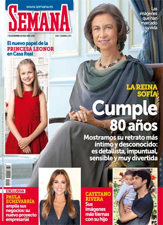 El cumpleaños de doña Sofía y la princesa Leonor son los principales contenidos de la publicación rosa. Doña sofía cumplió 80 años en compañía de sus hijos y nietos y la revista recalca su lado más íntimo y personal. A medida que transcurre el tiempo, la princesa Leonor va adquiriendo responsabilidades institucionales, y Semana se centra en cómo será el papel de la pequeña dentro de Casa Real.