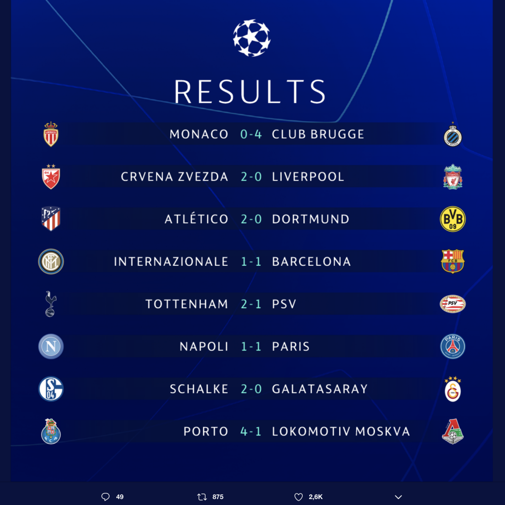 ? What a night! #UCL pic.twitter.com/ldYWsFdOty— UEFA Champions League (@ChampionsLeague) 6 de noviembre de 2018