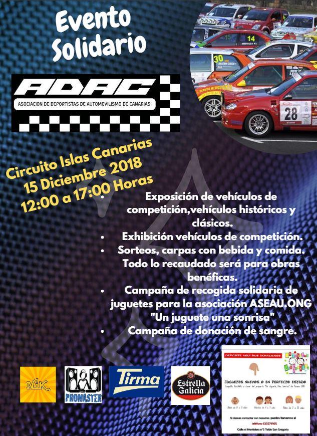 ADAC, Asociación de Deportistas del Automovilismo de Canarias, hace un llamamiento a la participación de este encuentro solidario que acoge el Circuito Islas Canarias de la ciudad de Telde, el Próximo Sábado de 12:00 a 17:00 horas, donde tendrá lugar, un día del motor y de solidaridad, con los mas necesitados.
