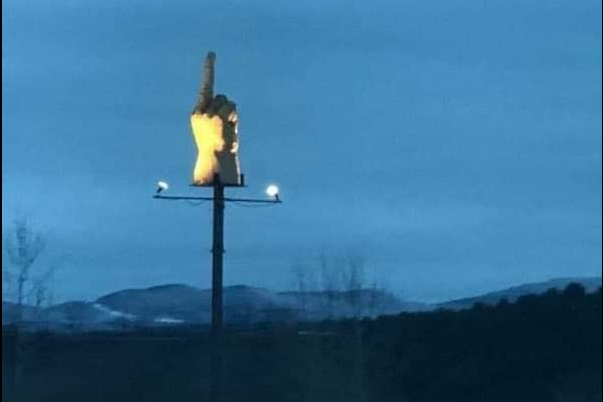 Pelkey se puso manos a la obra. Compró un tronco de pino de cinco metros de altura y encargó construir a un escultor local una mano gigante con el dedo corazón extendido; a la manera de una peineta. Colocó la mano sobre el tronco, y 'voilà': la venganza estaba lista.
