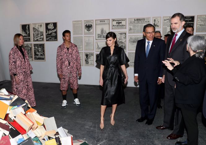 Durante la visita a ARCO, la reina ha sorprendido con un elegante look rockero compuesto de un vestido de cuero negro, unos zapatos beige y un bolso negro.