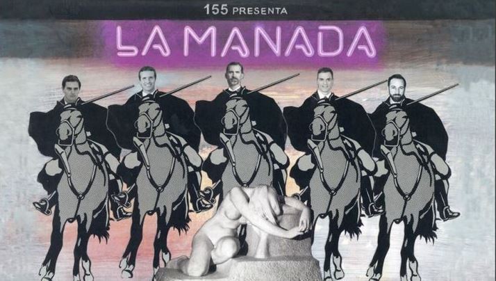 En el cartel realizado en tonos morados, y que lleva varios días luciendo en la fachada del consistorio, se puede leer el texto "155 presenta La Manada" y en él aparece el rey Felipe VI, el presidente del Gobierno Pedro Sánchez, el líder del PP, Pablo Casado, el de Ciudadanos, Albert Rivera, y el de Vox, Santiago Abascal, montando a caballo juntos. A sus pies aparece una mujer desnuda que parece haber sido víctima de algún daño. En la parte inferior, escrito en mayúsculas y en amarillo, aparece la palabra República.