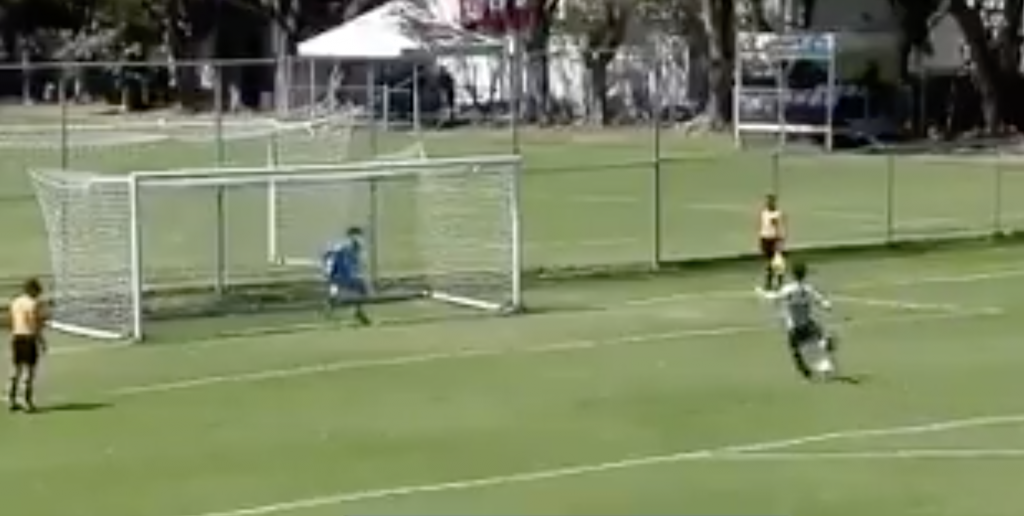 El esférico salió hacia arriba con mucha fuerza, y el portero se desentendió de la jugada. El efecto del golpeo hizo que la pelota, al botar de nuevo en el suelo, se introdujera en la portería ante la pasividad del guardameta.
