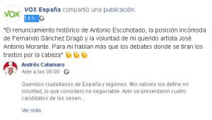 Tras la publicación de este texto, la formación de Santiago Abascal, la compartía en su perfil de Facebook.