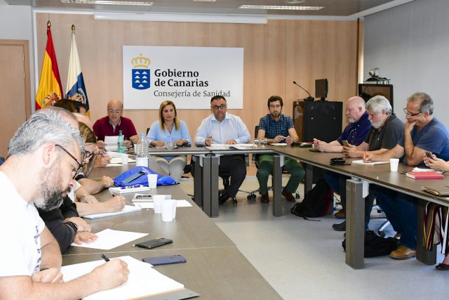 El director del Servicio Canario de la Salud (SCS), Conrado Domínguez, acompañado por la directora general de Recursos Humanos, Antonia María Pérez, presidió esta mañana una nueva reunión de la Mesa Sectorial de Sanidad en la que se aprobó la carrera profesional para el personal estatutario temporal del SCS, medida que se estima afectará a más de 5.000 profesionales de todas las categorías del SCS. También se acordó el calendario estimativo para la celebración de los exámenes de la Oferta Pública de Empleo correspondientes a la categoría de Facultativos Especialistas de Área.