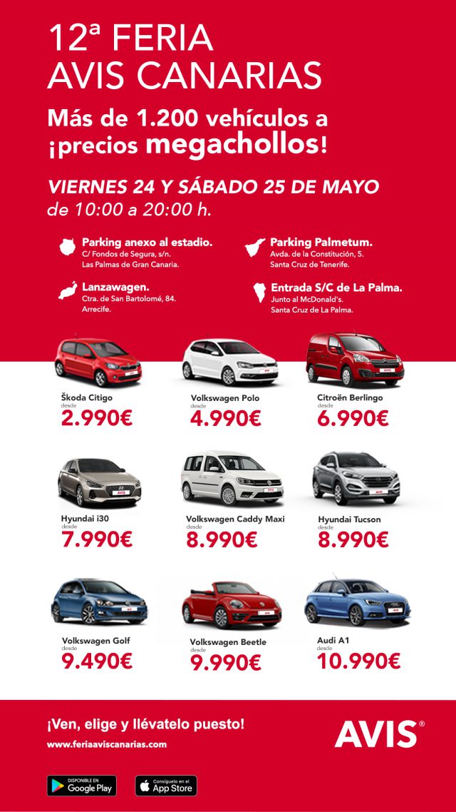 La Feria AVIS Canarias mantendrá informados a los interesados a través de la web del evento Feria Avis Canarias, donde se incluirán los modelos destacados de la Feria, las localizaciones donde se celebrará la feria y los horarios. Tanto en la página web, como en App Store y Google Play, los interesados podrán descargar directamente la aplicación de la Feria de Avis con la que podrán reservar su megachollo sin hacer colas y sin intermediarios. Rápido y sencillo.