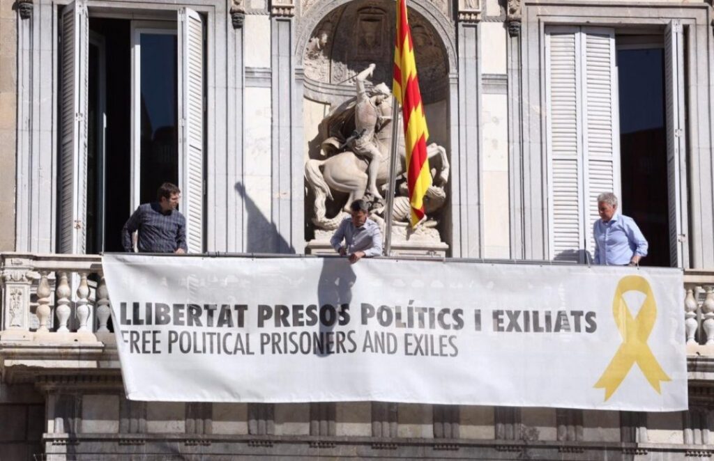 El balcó del palau de la Generalitat torna a tenir un llaç groc juntament amb la pancarta que diu "Llibertat presos polítics i exiliats" @govern | @bego_fuentes @tve_catalunya pic.twitter.com/L9okB3Evgv