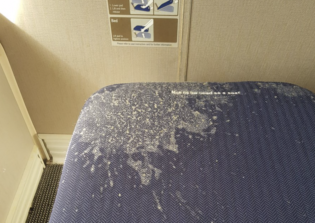 @British_Airways have DM'd you but haven't gotten a response so will try here. This was my seat from London to Seattle yesterday, covered in dried in vomit, no offer to move seats, just insinuation from the attendant that I had done it even though it was dried in for days pic.twitter.com/i3iVvlsPdC