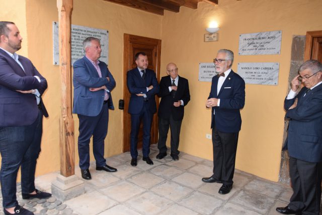 La Casa Verde Aguilar acogió este jueves el acto de celebración del 30 aniversario de la Escuela de la ULPGC de Gáldar, con la presencia del alcalde de la ciudad, Teodoro Sosa; el vicerrector de Estudiantes y Deportes, Antonio Ramos; el director de la Escuela, Roberto Moreno; y los directores de Aula de Humanidades y Sociales, Ciencia y Tecnología, Juan Sebastián López y Alexis Quesada, respectivamente. Un acto solemne y entrañable en el que se recordó la trayectoria de esta Escuela que surgió con el deseo de sacar fuera de las aulas de la ULPGC la formación y el conocimiento, acercando a la población del Norte su actividad. En este aniversario, y sumándose a los reconocimientos de anteriores rectores, el ex rector y profesor José Regidor, descubrió una placa en su honor que recuerda el apoyo de todo su equipo rector a esta iniciativa.