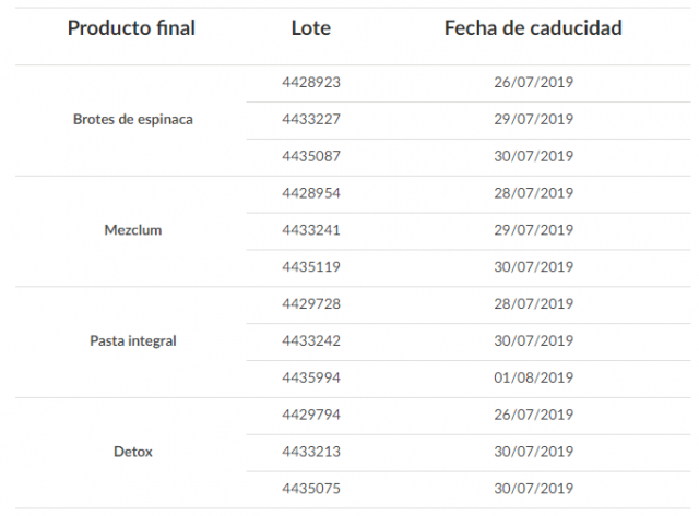 Florette ha decidido retirar los siguientes lotes de Brotes de espinaca, Mezclum, Pasta integral y Detox que se comercializaban en diferentes puntos de venta de las Islas Canarias. El motivo de esta acción se debe a que podrían estar contaminados con la bacteria E.coli, alertan desde la OCU.