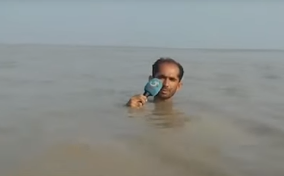 Un periodista acudió para cubrir la noticia de una inundación para el canal paquistaní 'G-TV News' y acabó literalmente con 'el agua al cuello'.