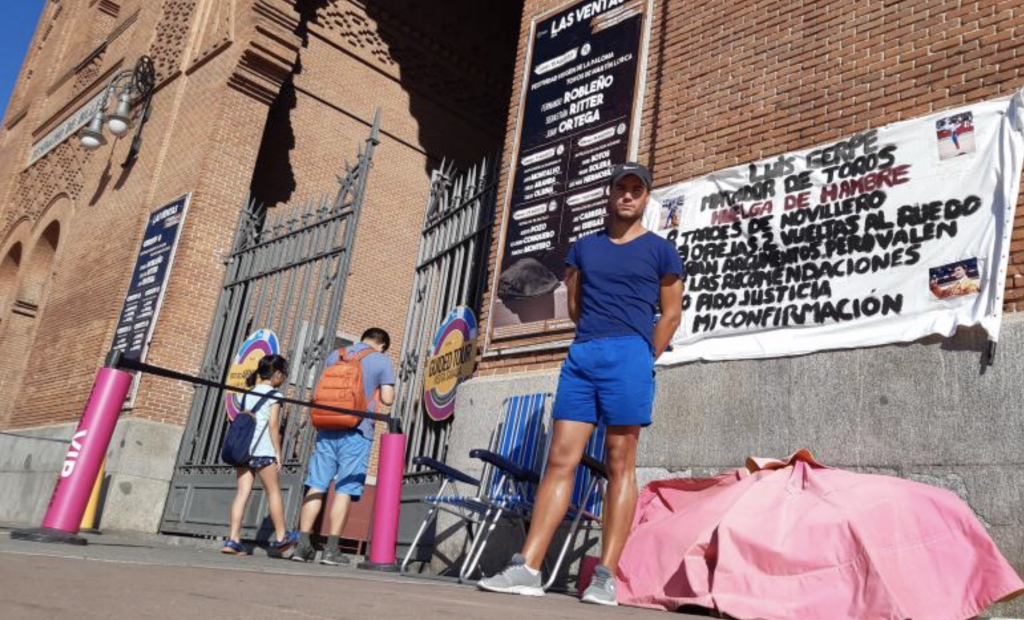 El torero Luis Gerpe lleva desde el pasado jueves instalado en huelga de hambre junto a la Puerta Grande de la plaza de toros de Las Ventas para pedir a la empresa que gestiona el coso madrileño que le contrate para torear en él. Dice que con esta reivindicación no pide “una oportunidad”, sino que se trata de “justicia” tras sus éxitos como novillero.