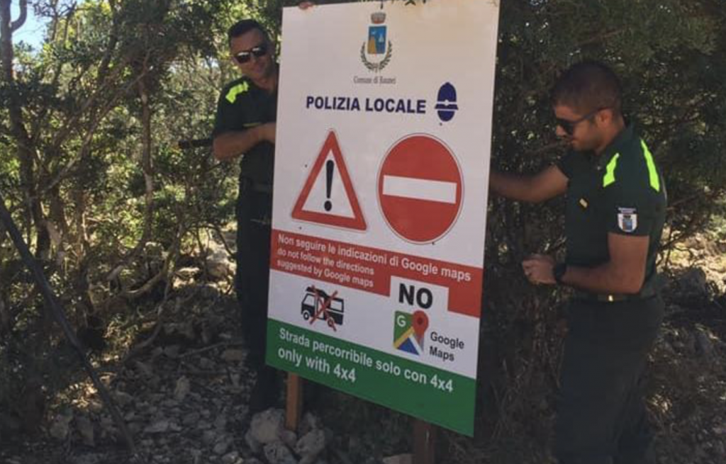 Salvatore Corrias, alcalde de Baunei, una localidad de Ogliastra, en la isla de Cerdeña, informó de que se están colocando carteles de advertencia a lo largo de varias carreteras, en los que se puede leer en inglés e italiano:"No sigan las instrucciones en Google Maps".