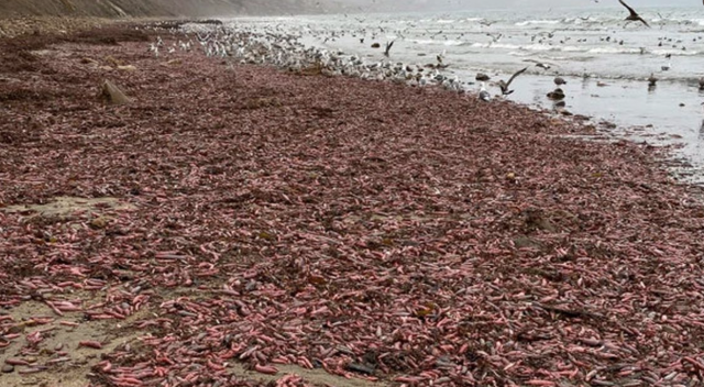 Miles de urechis unicinctus, una peculiar especie marina que habita en aguas poco profundas de China, y que se conoce popularmente con el nombre de 'pez pene' debido a la forma de su cuerpo, han aparecido varados en una playa de California, Estados Unidos.