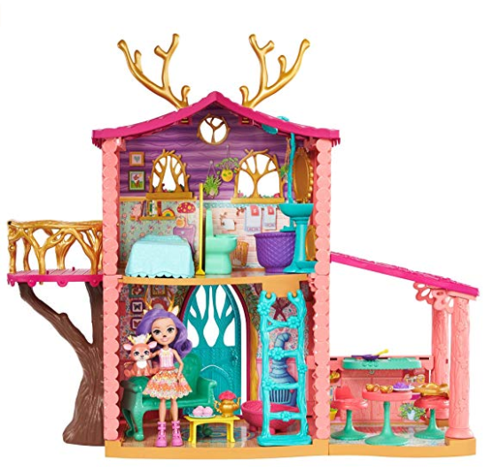 - El conjunto de juego de Enchantimals viene con la muñeca de 15 cm, una casa de muñecas de casi 60 cm de altura con cinco áreas de juego y más de 15 piezas desmontables de muebles y accesorios
