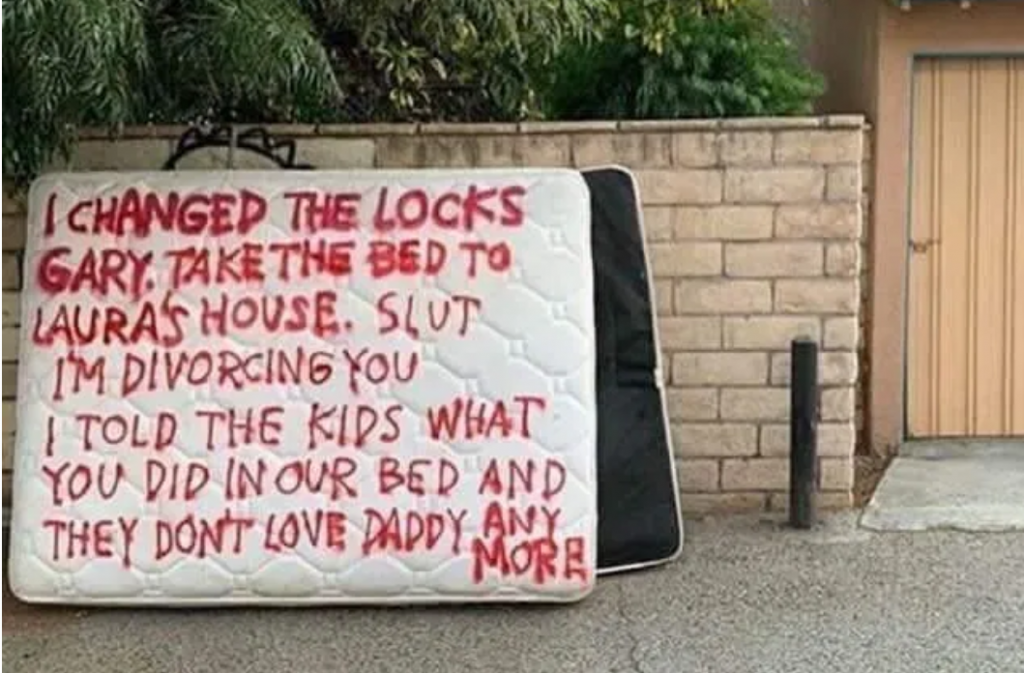 “Cambié las cerraduras, Gary. Lleva la cama a la casa de Laura. Zorra. Me divorcio de ti. Le dije a los niños lo que hiciste en nuestra cama y ellos ya no aman a papi”, escribió la vecina.