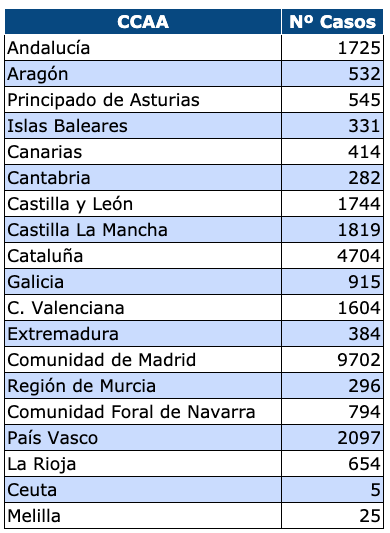 La Comunidad de Madrid sigue siendo la que más casos ha registrado, seguida de Cataluña y del País Vasco.