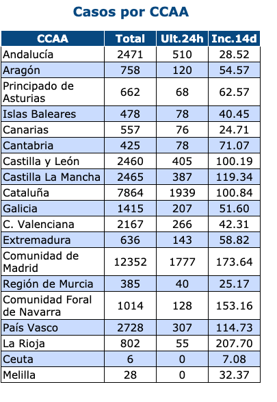 El País Vasco y Andalucía ocupan la tercera y cuarta plaza en el triste ránking de infectados. Euskadi tiene 2.728 casos positivos y Andalucia 2.471, seguida de Castilla-La Mancha con 2.465 y Castilla y León con 2.460 infectados.