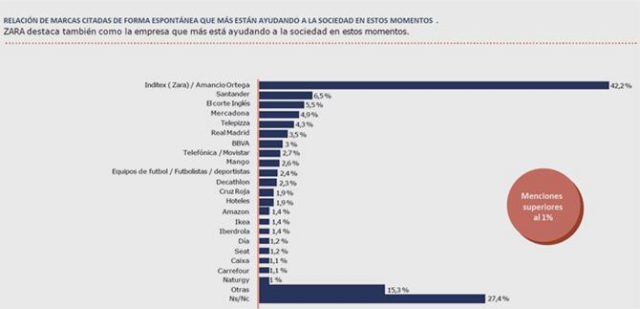 Cuando se pide a los consumidores consultados que mencionen de forma espontánea las marcas que están contribuyendo a minimizar el impacto del coronavirus Zara (Inditex) es la marca más citada (51,1%), por delante de Banco Santander (11,1%), el Real Madrid (10,1%), Telepizza (7,4%) y El Corte Inglés (7%).