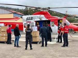 La Consejería de Sanidad del Gobierno de Canarias ha distribuido hoy material destinado a los centros sanitarios y sociosanitarios de todas las islas para la protección del personal y hacer frente a la propagación del Covid-19. La distribución del material, que partía desde un almacén central de Tenerife, se ha realizado con la ayuda del GES y del CECOES que ha desplegado sus helicópteros para el traslado del material a todos los puntos del Archipiélago al mismo tiempo.