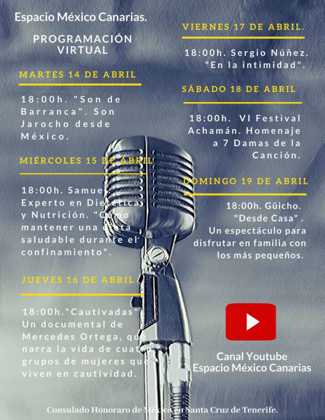 El Espacio México Canarias, dependiente del Consulado Honorario de México en Santa Cruz de Tenerife, bajo la Dirección Cultural de Yolanda Cordobés, lleva ofreciendo una programación virtual en su canal de Youtube. "Espacio México Canarias", variada y constante, prácticamente desde el inicio del confinamiento en España. Concretamente desde el 21 de marzo con el Día Mundial de la Poesía. Música, Danza, Teatro, Gastronomía, Documentales, Charlas, Manualidades, Salud, Recorridos Virtuales.... Todo tiene cabida en esta programación.