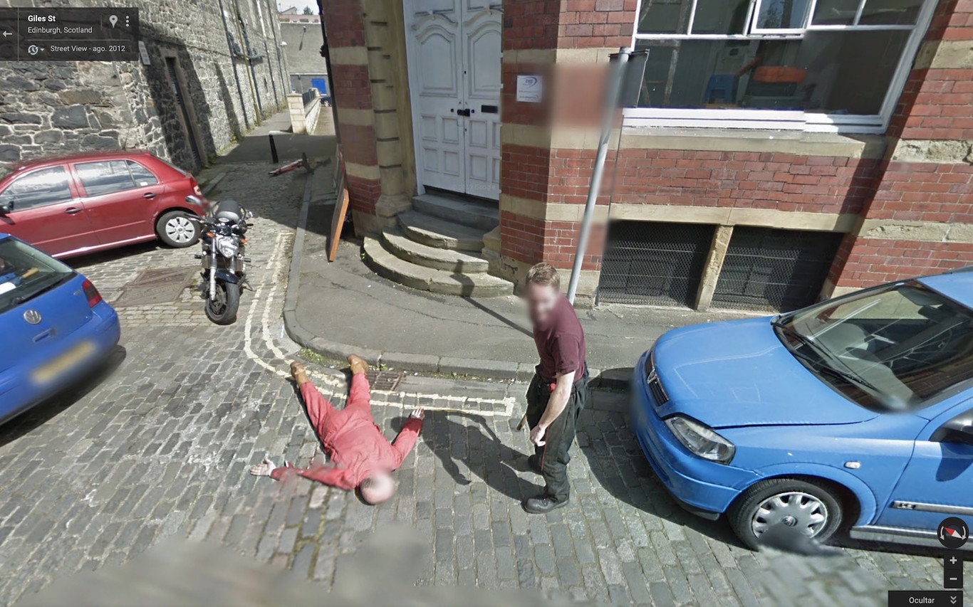 Dan Thompson, el propietario de un taller en Escocia, decidió fingir un asesinato brutal en la calle justo cuando pasaba un coche que se encargaba de grabar las imágenes para Google Street View. El mismo había pactado con su 'víctima' el falso homicidio. En la imagen que ha sido difundida en la red, se ve como el 'asesino' porta un hacha-