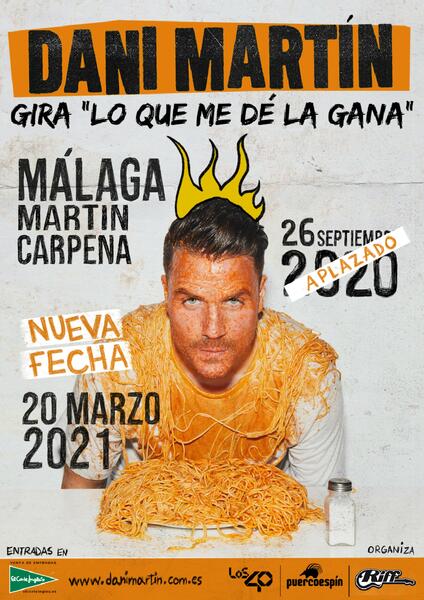 Dani Martín ha anunciado el aplazamiento de su gira 'Lo que me dé la gana' a 2021 en la que se encuentra la fecha prevista para Málaga el próximo 26 de septiembre, que pasará a celebrarse el 20 de marzo de 2021