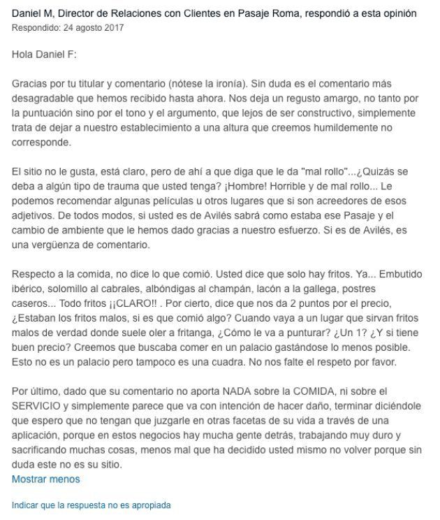 Hay otra gente que usa estas plataformas para verter su odio, su frustración y quizás su no saber estar para dañar la imagen de los restaurantes. Por suerte siempre hay dueños ingeniosos que responden como es debido a estas personas.