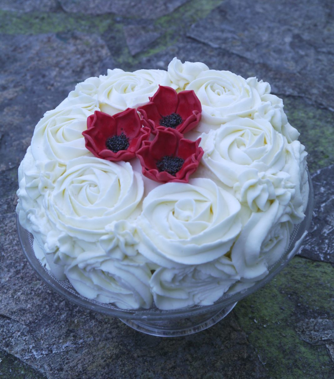 A base de nata y una manga pastelera hay que tener un buen pulso y calcular bien las distancias para hacer que la crema haga la forma de rosas blancas. También tienen su arte las tres florecillas que adornan lo alto del pastel. Un postre ideal para amantes de las flores pero que daría mucha pena el hincarle el diente y romper con un cuchillo todas las rosas.