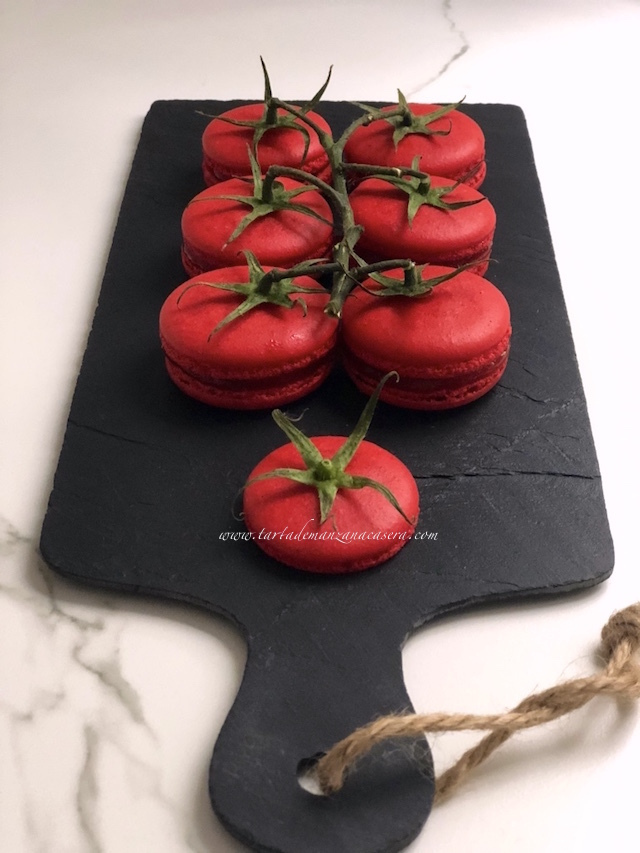 ¿Son tomates? ¿Son Macarons? Son tomacarons. Un postre de origen francés y que ya de por si lleva su truquillo para hacerlos bien y que tengan una textura buena y agradable. Si les ponemos colorante rojo y unas hierbitas por encima, les damos el aspecto de tomate. Solo falta saber el relleno.