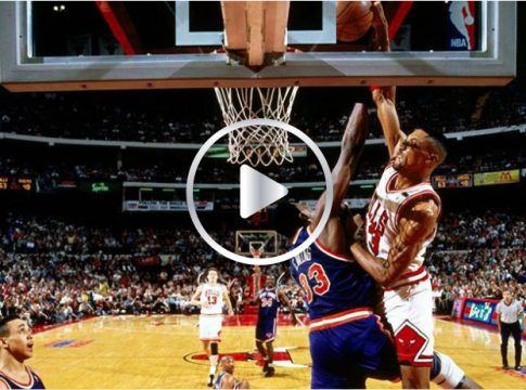 En una de las jugadas más espectaculares de la dinastía Bulls de los 90 podemos ver como Scottie Pippen vuela frente los 2.13 metros de Ewing y realiza una brutal volcada dejando al pivot de los Knicks en el piso sin reacción.