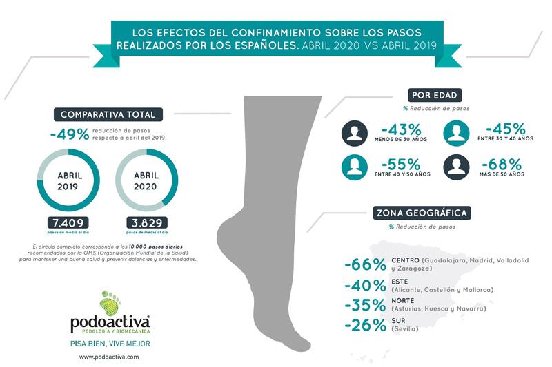 Durante el pasado abril, los ciudadanos completaron una media de 3.829 pasos cada día, por los 7.409 registrados en el mismo mes de 2019. Así se desprende del informe de la Fundación Podoactiva, con datos recabados en 11 provincias españolas a hombres y mujeres de edades comprendidas entre los 23 y los 65 años.