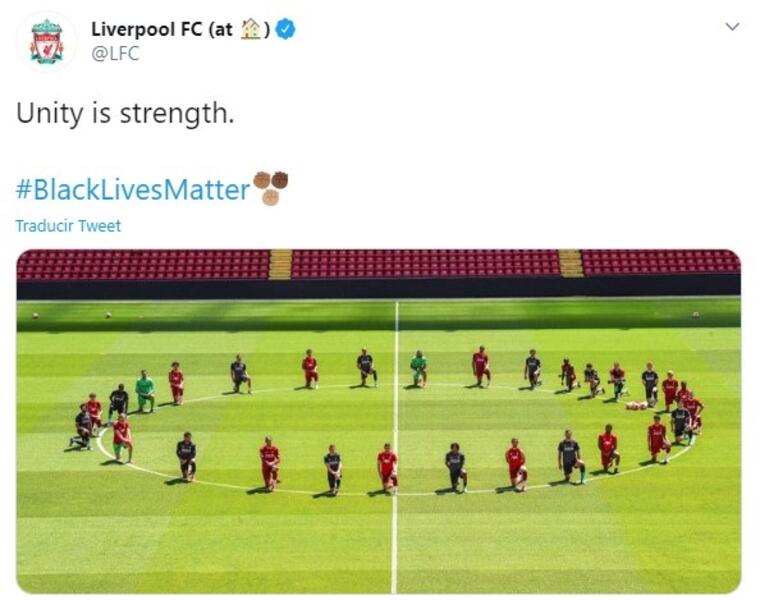 "La unión hace la fuerza", escribió el club inglés en la red social Twitter, acompañado del 'hashtag' #BlackLivesMatter -'Las vidas negras importan'- y de una fotografía del equipo al completo arrodillado sobre el campo de entrenamiento. Los jugadores, además, compartieron la misma imagen y el mismo mensaje en sus redes sociales.