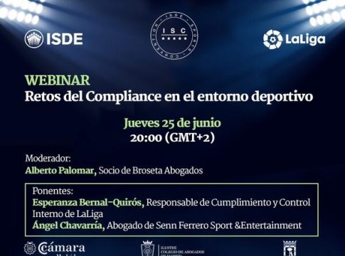 La responsable de Cumplimiento y Control Interno de LaLiga, Esperanza Bernal-Quirós, y el abogado Ángel Chavarría abordarán de los Retos del Compliance en el deporte en el próximo ISDE Webinar, el encuentro digital impulsado por el Instituto Superior de Derecho y Economía (ISDE) que se celebra este jueves (20:00 horas) dentro de las actividades del ISDE Sports Covention (ISC).