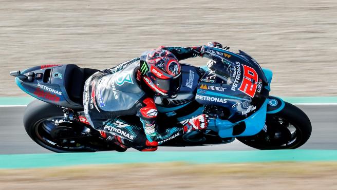 El piloto francés Fabio Quartararo (Petronas Yamaha) ha ganado este domingo el Gran Premio de España, en el Circuito de Jerez-Ángel Nieto, y es el primer campeón de este atípico Mundial 2020 reducido por el coronavirus, con Maverick Viñales (Yamaha) y Andrea Dovizioso (Ducati) completando el primer podio de la categoría reina.