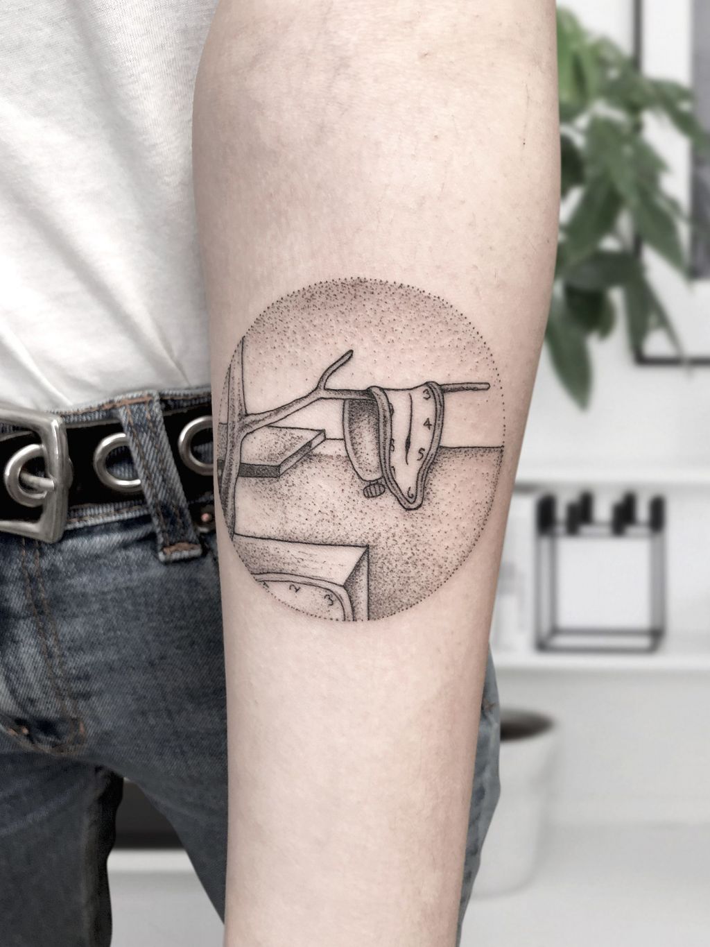Este último el de los relojes blandos, llamado La persistencia de la memoria es el que se ha hecho el chico de la foto. El propio Dalí admitió que un queso camembert fue el inspirador del cuadro. Aquí se puede ver el reloj haciendo equilibrio en la rama del árbol, pero faltaría parte del cuadro. Aunque es un tatuaje loco, está hecho con gusto