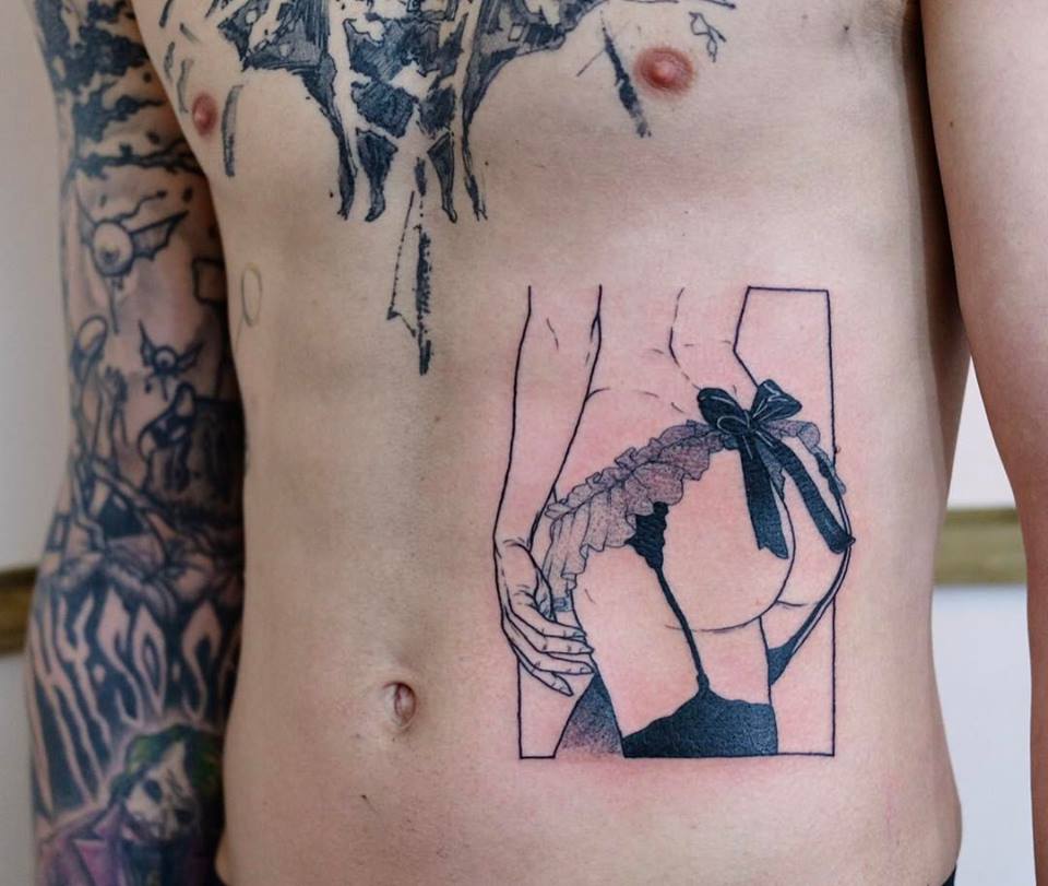 Este tatuaje es una de las piezas del tatuador Sad Amish, especializado en el género. Hace tatuajes eróticos dulces, orgásmicos, divertidos, gráficos, explícitos en algún caso. Sabe plasmar con una rodilla o con la caída del pelo la energía de cada momento. Los cambios de perspectiva son utilizados por el artista para establecer el tono de las escenas. Tatuajes pensados y que son arte.