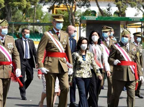 El jefe de la Brigada 'Rey Alfonso XIII' II de la Legión, el general de Brigada Marcos Llago, ha sido el encargado de presentar al monarca los trabajos realizados para la construcción del palco tras finalizar el acto, que ha contado además con la presencia del jefe del Estado Mayor del Ejército, el general Francisco Javier Varela --quien fue general jefe de la Brigada de la Legión 'Rey Alfonso XIII' durante casi dos años--, y la ministra de Defensa, Margarita Robles.