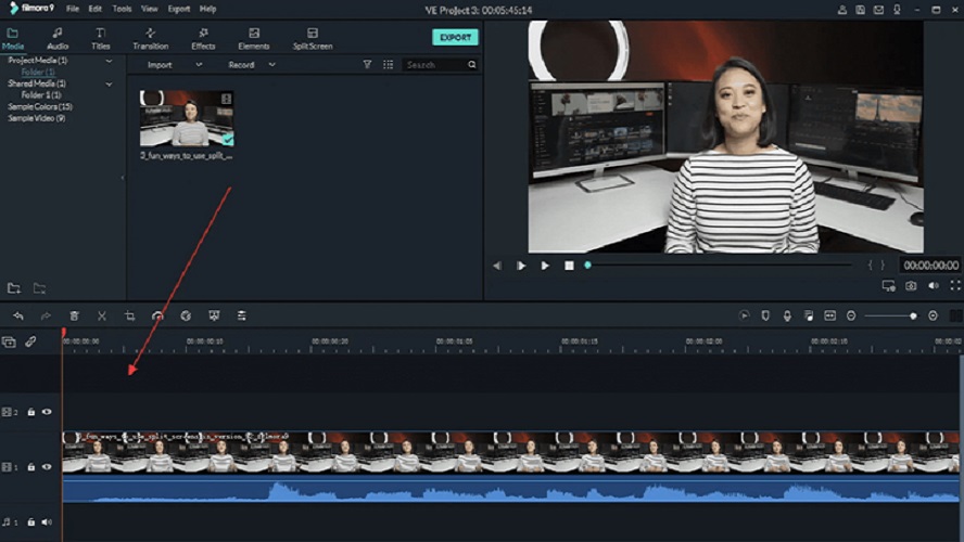 2. Luego, importa el clip a Filmora desde la biblioteca de archivos de tu equipo. Afortunadamente, ésta aplicación acepta una gran variedad de formatos de vídeo, por lo que será muy difícil que aparezca un recuadro de incompatibilidad al importar el clip. Una vez que haya cargado, arrástralo a la línea de tiempo para proceder a editarlo.