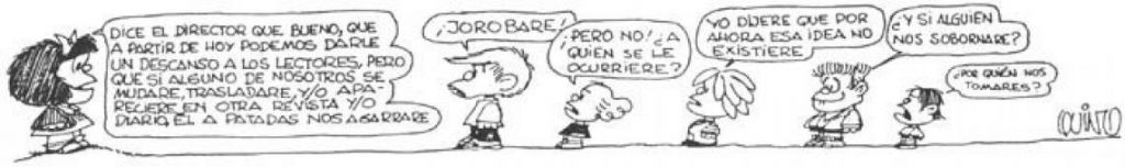 Mafalda cerraba cerca de 10 años de aparición continuada. En ella, la niña se despedía de todos los lectores junto a todos sus amigos. Aquí no había crítica, tan solo dejaba claro que no iba a volver a aparecer en ningún otro medio ni revista.