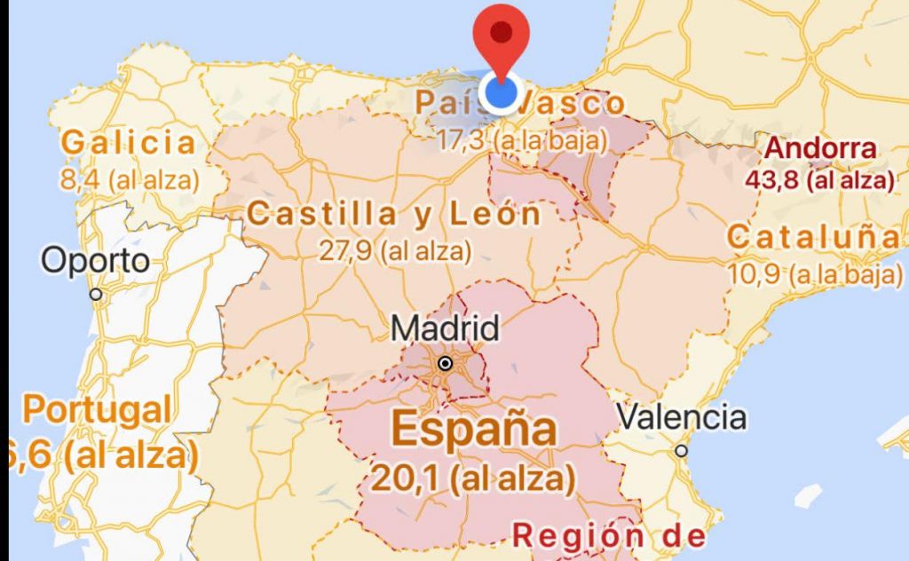 Las regiones están coloreadas con distintos tonos de rojo dependiendo del grado de incidencia del virus en los últimos 7 días. Ahora mismo son Madrid, Ceuta, Melilla y Navarra las que lideran con el rojo más fuerte. Castilla-León, Castilla-La Mancha, Murcia y La Rioja están coloreadas en tonos algo más suaves. El resto de España, incluido Canarias, con menor incidencia, apenas muestran un tono rojizo.