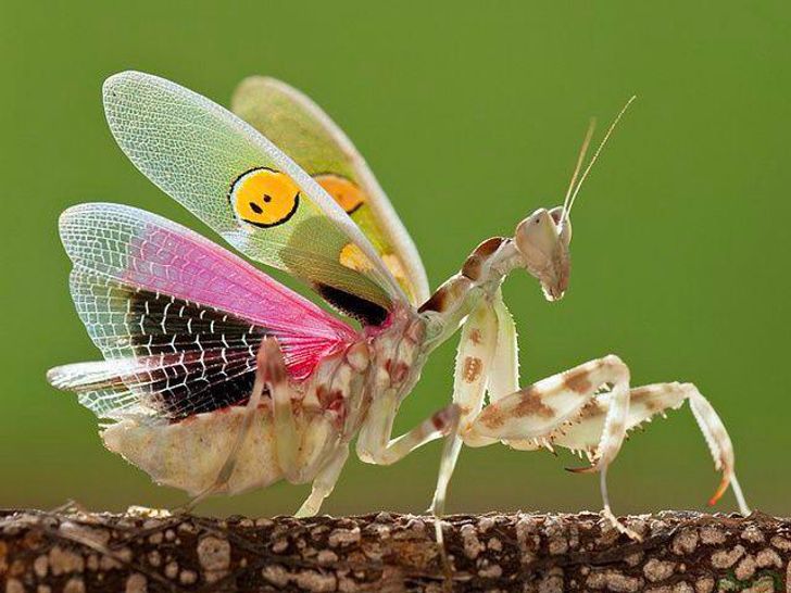 Cuando las mantis se sienten en peligro, despliegan las alas para mostrar dos manchas que imitan dos ojos. Además, parecen más grandes de lo que son en realidad. Estas mantis se pueden encontrar en todo el territorio de África subsahariana.