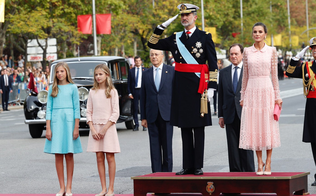Tradicionalmente, el 12 de octubre se celebra con un gran desfile militar por las calles de Madrid, con la participación de miles de miembros de las Fuerzas Armadas, vehículos y aviones militares; al que sigue una recepción en el Palacio Real a la que asisten los poderes del Estado, expresidentes del Gobierno y representantes del mundo económico, universitario y de la sociedad civil.
