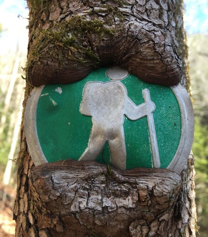 Aquí vemos la acción y la fuerza de la naturaleza ante una señal de paso de caminantes. El clavo hizo una herida en el tronco y sobre esa herida se ha ido formando más corteza que ha terminado por empezar a comerse la señal e incluso doblar el propio metal.