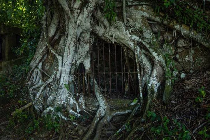 Esta imagen la hemos visto repetida en libros, películas y videojuegos de fantasía. Es muy similar a la prisión de un malvado personaje mágico. Sin embargo, vemos que es real y que al árbol le ha dado igual lo que estuviera por debajo. Seguro que pronto cubrirá todo con sus ramas.