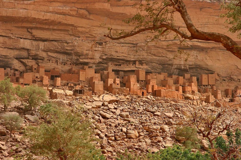 En el país africano de Mali, a lo largo del río Níger, que atraviesa unos 200 kilómetros del país, vive una tribu muy especial. Este río ha ido creando unos acantilados en la tierra caliza de la zona. Este es uno de los pueblos de la tribu dogón.