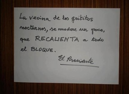 El presidente, no sabemos si de la comunidad o del gobierno, ha demostrado que tiene arte. Este cartel es la prueba de ello. Va dirigido a la vecina de los grititos. Como pudiéramos pensar, no le afea la conducta.