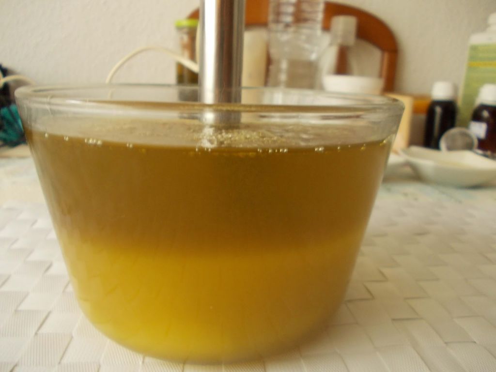 Con el agua y la sosa a unos 40 grados y el aceite mezclado, pondremos el primero en el bol del segundo. A medida que vayamos mezclando iremos viendo como la textura del aceite se va alterando y va cambiando.