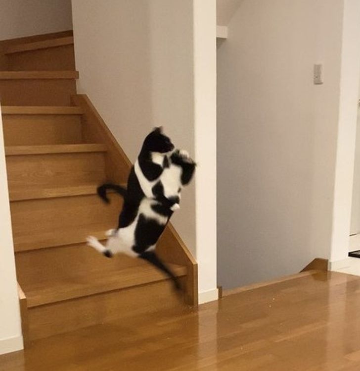 Las peleas entre mascotas que viven en la misma casa suelen ser habituales. Captar un momento en el que ambos animales estén agarrados en el aire, no lo es tanto. Si en vez de hacer tanta foto, el dueño hubiera separado a los gatos, les hubiera ahorrado un buen golpe.